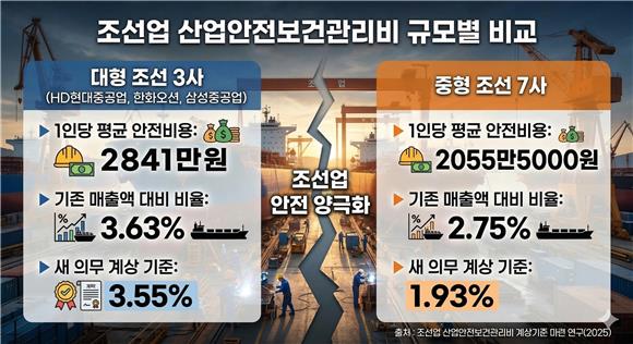 메뉴설정 홈 > 산업 > 전체 단독 조선 3사 매출 ‘3.55%’ 안전비용 의무화 추진 HD현대중공업(329180), 한화오션(042660), 삼성중공업(010140) 등 조선 3사 매출액의 3.55%를 산업안전보건관리비로 의무 계상하는 제도 도입의 밑그림이 나왔습니다. 명확한 기준 없이 자율에 맡겨졌던 조선업 안전 비용을 구체화하고, 영세 하청업체 대신 원청 조선사가 예산을 책임지도록 하는 내용이 핵심입니다. 특히 매출액 1조원 이상 대형 조선사는 3.55%, 1조원 미만 중형 조선사는 1.93%를 산업... - 삼성중공업, 업계 최초 로봇 배관 공장 가동 - [IB토마토](기술 국산화 과제)①기술 국산화, 시작부터 높은 벽…확산 위한 민관 '맞... 중국 찾는 이재용·곽노정, CDF서 협력안 모색 수입차 신규등록 두 달 만에 3만대 돌파…테슬라 1위 작년 상용근로자 연봉 5000만원 첫 돌파 최신기사 장금상선, 세계 1위 MSC에 유조선사 지분 매각 2026.03.21 12:16 해운전문기업 장금상선이 글로벌 최대 컨테이너 선사인 스위스 MSC에 유조선 사업 계열사 지분 50%를 매각합니다. 장금상선 정태순 회장.(사진연합뉴스) 21일 로이터통신 등 ... 손정의, 753조 규모 ‘AI 데이터센터’ 건립 추진 2026.03.21 18:51 손정의 일본 소프트뱅크그룹 회장이 미국 오하이오주에 초대형 인공지능(AI) 데이터센터 건립에 나섭니다. 손정의 소프트뱅크 회장. (사진뉴시스) 21일 닛케이신문과 교도통신 ... 티웨이항공 인천-사가 노선 탑승률 95% 2026.03.20 16:36 티웨이항공 인천-사가 노선의 2026년 1~2월 탑승률은 95%로 집계됐다고 20일 밝혔습니다. 이는 2025년 동기간 83% 대비 크게 상승한 수치다. 2026년 3~4월 예약율 또한 ... 반도체 특수 이면에…삼성·하닉, 2년 연속 온실가스 배출량 상승 2026.03.20 13:55 삼성전자와 SK하이닉스의 온실가스 배출량이 2023년 이후 2년 연속 상승세를 이어가고 있는 것으로 나타났습니다. 인공지능(AI) 산업 확대로 빅테크 기업들의 메모리 반도체 수... 김정관 “여수 석화 구조개편, 재도약 전환점 되도록 지원” 2026.03.21 18:52 김정관 산업통상부 장관이 “대산에 이은 여수의 석유화학 산업 구조개편이 석유화학 산업의 재도약 전환점이 되도록 정책 역량을 집중하겠다”고 강조했습니다. 김정관 산업... (부음)손재일(한화에어로스페이스 대표이사)씨 부친상 2026.03.21 18:53 △손우영씨 별세, 손재일(한화에어로스페이스 한화시스템 대표이사)씨 부친상 -일시 : 2026년 3월21일-빈소 : 아주대병원 장례식장 1호실-발인 : 2026년 3월23일 오전 9시-연락처:... 더보기