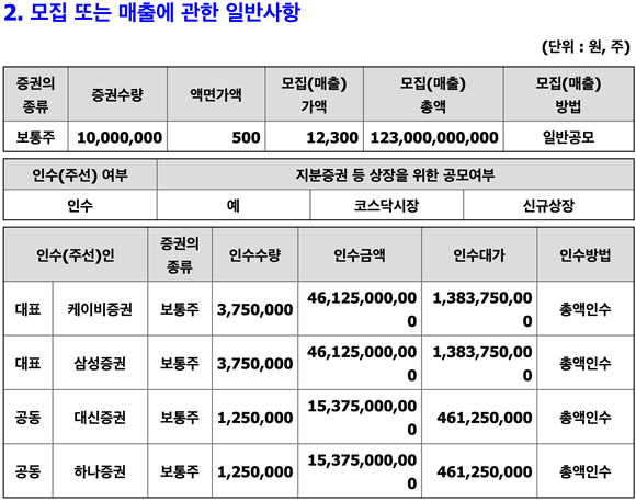 대신증권(003540)과 하나증권이 인수단에 합류했다. 청약기일은 오는 4월1일부터 2일까지다. 인수단은 별도로 발행된 신주를 취득한다. 공동대표주관사가 각각 3만488주, 나머지 주관사가 각각 1만162주를 취득하며, 인수단은 상장 후 1년간 의무보유한다. 규정상 3개월 의무 보유가 원칙이나 책임 강화 차원에서 의무보유기간을 늘렸다.