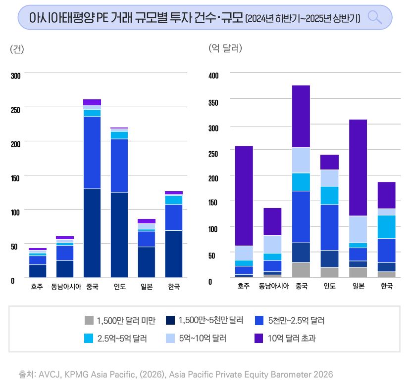 삼정KPMG 경제연구원이 지난달 발간한 '2026 아시아태평양 PE 투자 트렌드와 기회' 보고서에 따르면 미드마켓(1500만~5억달러, 약 210억~7000억원) 딜 비중은 2024년 하반기 32%에서 2025년 상반기 45%로 확대되면서 반년 만에 13%p 증가했다. 초대형 딜이 줄어들면서 투자 규모는 감소했지만 중소형 거래가 늘어나면서 미드마켓 비중이 확대된 것이다.