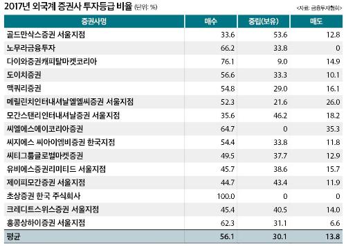 4일 금융투자협회에 따르면 2017년 국내 시장에서 보고서를 낸 외국계 증권사는 총 15곳이며, 이들이 낸 매도 보고서 비율은 전체의 14%에 이르는 것으로 집계됐다. CLSA코리아증권의 매도 보고서 비율이 35%로 가장 높았고 메릴린치인터내셔날엘엘씨증권 서울지점(26%), 모간스탠리인터내셔날증권 서울지점(18%), 맥쿼리증권(16%), 다이와증권캐피탈마켓코리아(15%) 등의 순이었다.