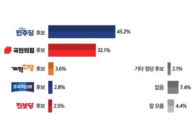• (지선 여론조사)⑦통합 단체장 지지 정당, 민주 45.2% 대 국힘 32.1%