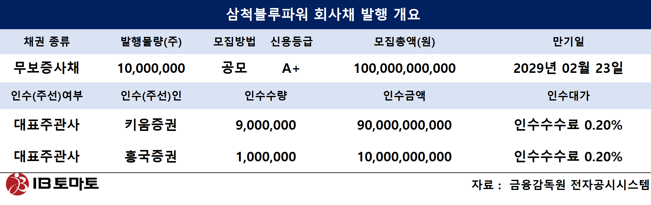 13일 금융감독원 전자공시시스템에 따르면, 삼척블루파워는 1000억원 규모 무기명식 이권부 무보증사채 수요예측에서 1520억원 주문을 받아 완판했다. 금리 결정에서도 개별 민간채권 평가회사 평균금리(민평 금리) 기준 ±30bp(1bp=0.01%포인트)를 제시했고 –41bp에서 주문을 채웠다.