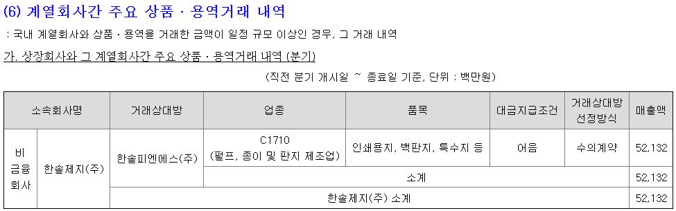 한솔제지는 한솔피엔에스와 인쇄용지, 백판지, 특수지 등을 거래했으며, 직전 분기 기준 거래금액은 약 521억원으로 집계됐다. 거래 방식은 경쟁입찰이 아닌 수의계약로 이뤄졌다.