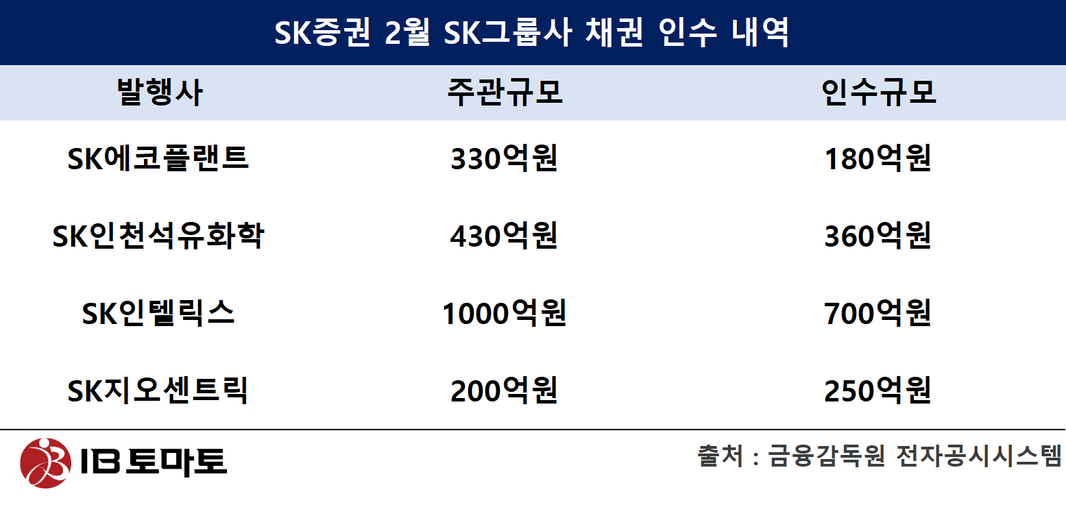 이번 SK그룹 계열사 채권 발행에서 SK증권은 SK에코플랜트 1년물 180억원, SK인천석유화학 2년물 360억원의 인수 실적을 기록했다. 주관 실적 역시 SK에코플랜트 330억원, SK인천석유화학 430억원에 그쳤다.