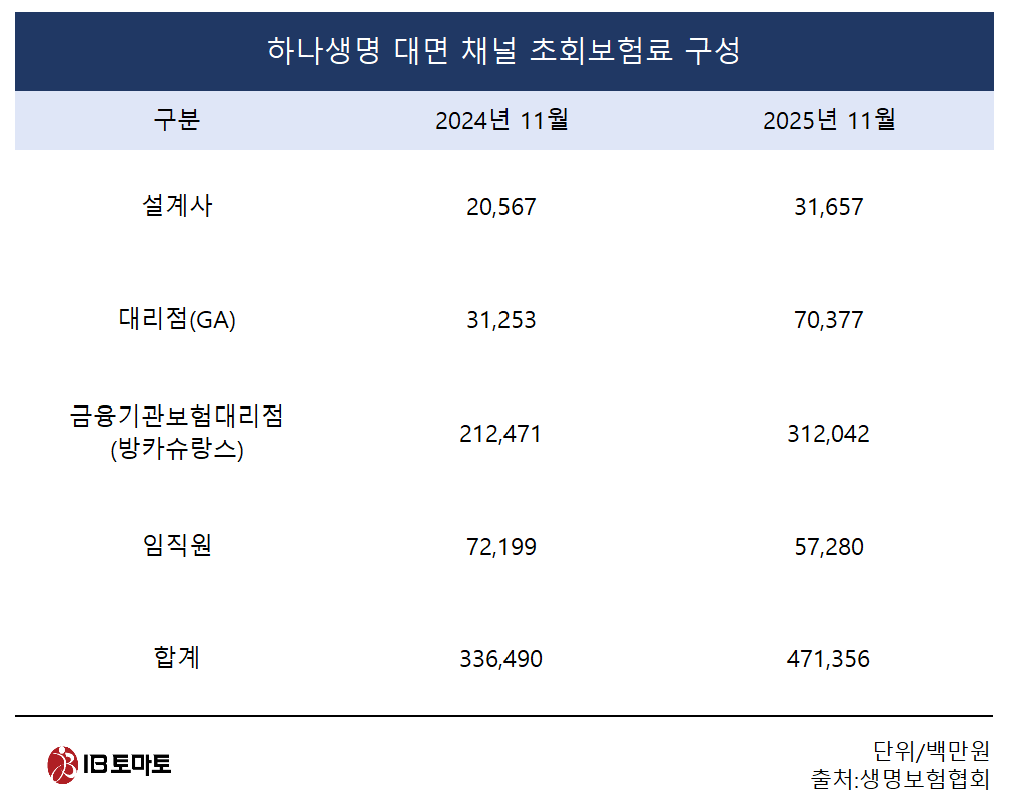 [IB토마토 황양택 기자] 하나생명이 법인보험대리점(GA)과 제휴를 빠르게 늘려가고 있다. 대면 영업 채널을 강화해 보장성보험 판매에 힘을 싣겠단 목적에서다. 해당 채널에서 초회보험료가 크게 늘어 성과도 나타나고 있다. 채널 다각화 측면에서 내부의 전속설계사 인원도 확대 중이다.