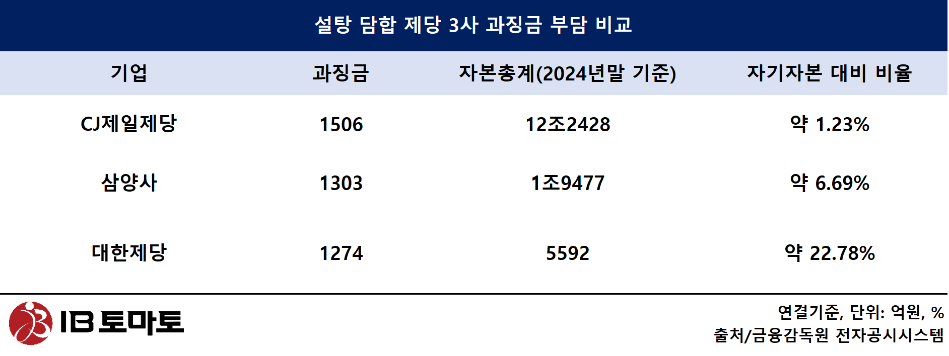 10일 제당업계에 따르면 지난달 공정거래위원회는 대한제당에 제당3사 가격 담합과 관련해 1274억원의 과징금을 부과했다. 이는 대한제당의 지난해말 기준 자기자본(5592억원)의 22.78%에 해당되는 금액이다. 대한제당이 3사 중 가장 적은 과징금액이지만, 타격은 가장 클 것으로 예상된다. 3사 중에서 자기자본 대비 과징금 규모가 가장 크기 때문이다.