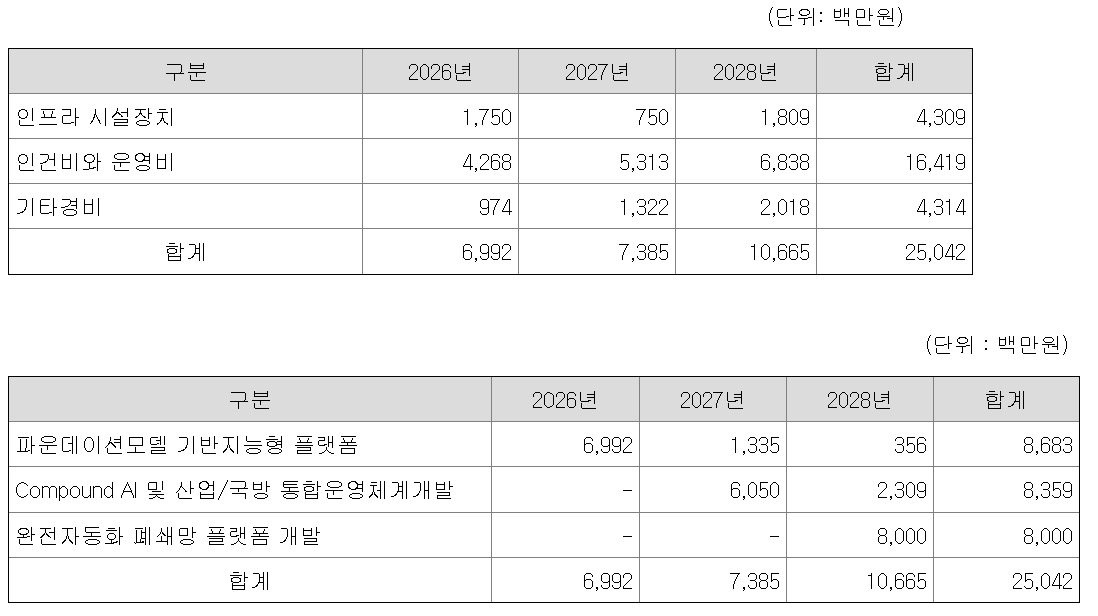 회사는 2026년을 파운데이션 모델을 활용해 런웨이 플랫폼을 지능형 에이전틱 AI 플랫폼으로 전환하는 단계로 설정했으며, 파운데이션 모델 기반지능형 플랫폼, 컴파운드 AI 및 산업/국방 통합운영체계개발, 완전자동화 폐쇄망 플랫폼 개발에 250억원을 단계적으로 투입할 예정이다. 이 밖에 일본현지법인 구축과 해외 시장 진출에 74억원이 투입된다.