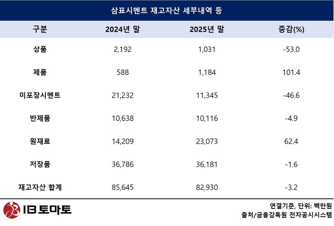 눈에 띄는 부분은 원재료 재고다. 지난해 말 기준 원재료는 230억원으로 전년(142억원) 대비 62.4% 증가했다. 출하와 생산이 둔화된 상황에서도 원재료가 늘어난 것은 시멘트 산업 특유의 운영 구조와 맞닿아 있는데, 시멘트 공장은 특성상 가동을 완전히 멈추기 어렵고, 유연탄·석유코크스 등 주요 연료는 가격 변동성과 수급 불확실성이 크기 때문이다.