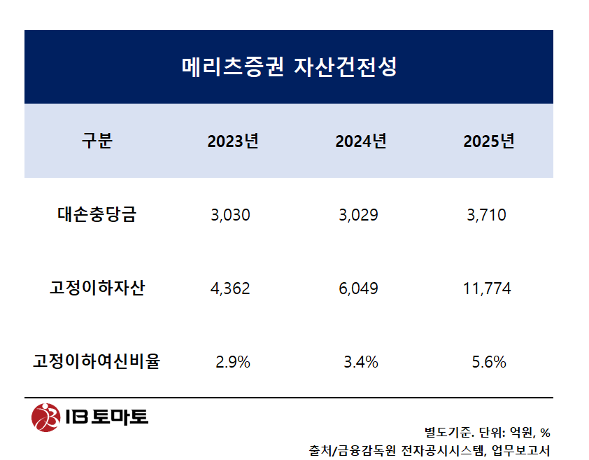이에 메리츠증권은 자본 확충에 속도를 내고 있다. 지난해 6월 모회사인 메리츠금융지주를 대상으로 500억원 규모 유상증자를 실시한 데 이어, 11월에는 5000억원 규모의 전환우선주(CPS)를 발행한 바 있다. 이에 따라 자기자본은 6조9042억원에서 8조1654억원으로 18.3% 확대됐다. 2025년 CPS와 신종자본증권 발행으로 영업용순자본 규모가 전년 대비 22% 증가했다.