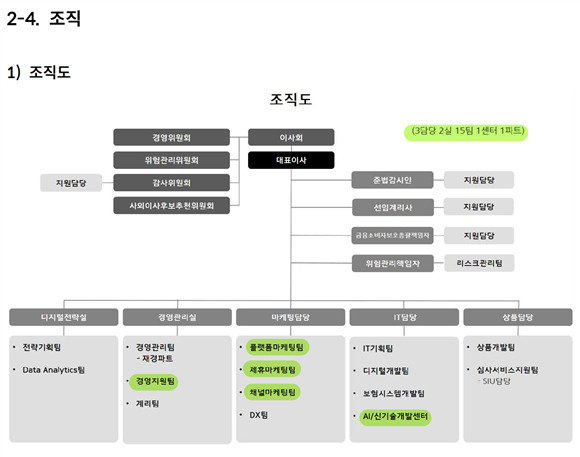 조직 구성은 마케팅·IT·상품 3담당과 경영관리·디지털전략 2실로 큰 틀을 잡고 그 밑에 팀과 파트, 센터 등을 두는 형태다.