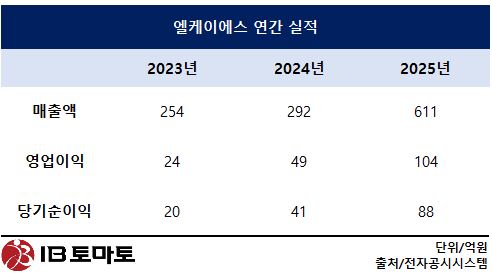 16일 금융감독원 전자공시시스템에 따르면 엘케이에스의 지난해 연결 기준 매출은 611억원으로 전년(292억원) 대비 두 배 이상 올랐고, 영업이익도 49억원에서 104억원으로 확대됐다. 당기순이익 역시 41억원에서 88억원으로 증가하며 수익성과 성장성을 동시에 끌어올리는 데 성공했다.