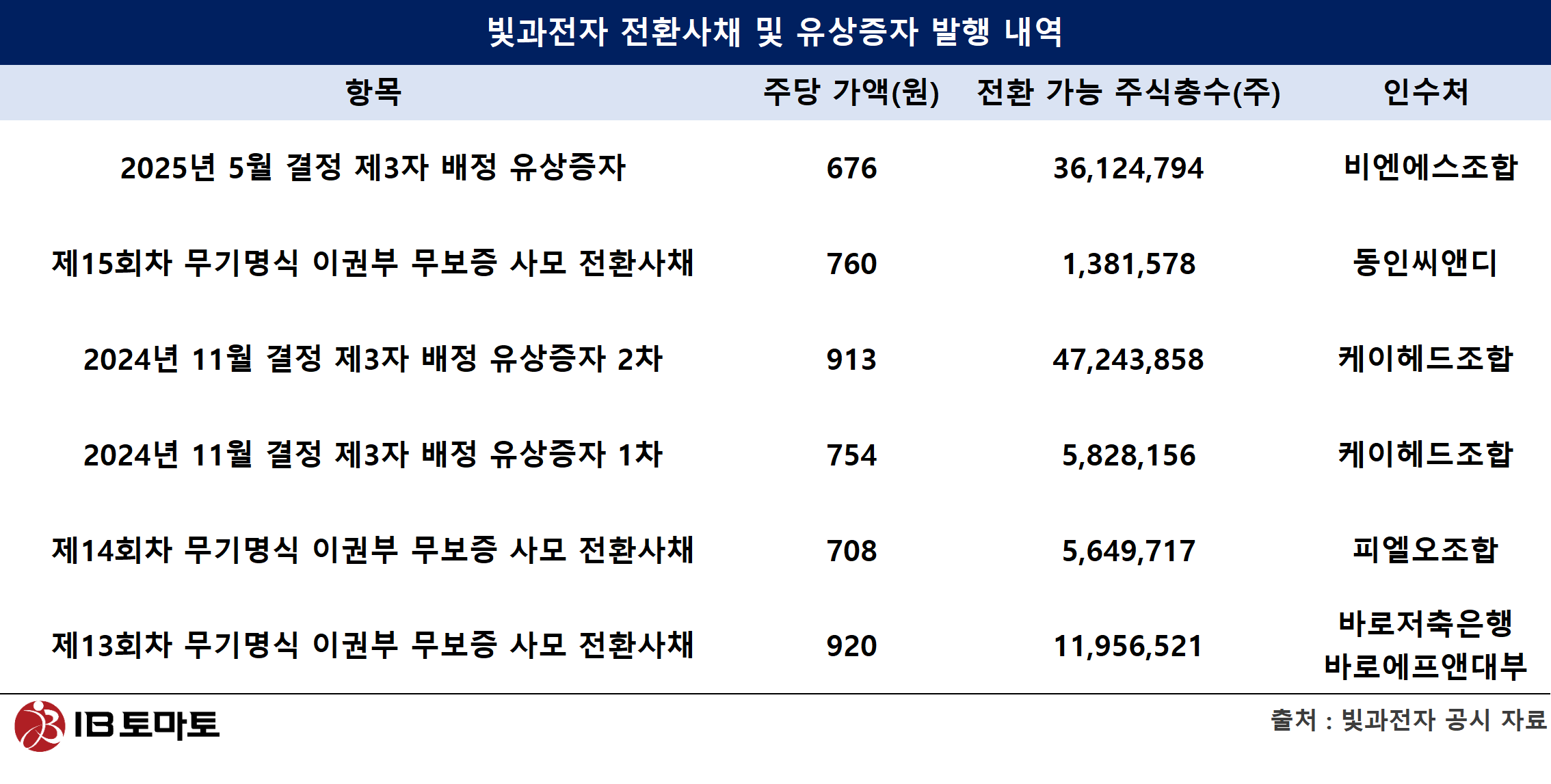 업계에서는 빛과전자의 최근 행보를 단순한 사업 다각화로만 보기 어렵다는 반응도 있다. 적자 누적 국면에서 조달 자금 상당 부분이 본업과 거리가 있는 자회사로 이동한 데다 회수 구조와 수익 실현 경로도 아직 뚜렷하지 않기 때문이다. 여기에 CB와 유상증자로 조달한 자금은 향후 전환주식 출회와 지분 희석 문제로 이어질 수 있어 소액주주도 예민하게 볼 수밖에 없다는 설명이다.