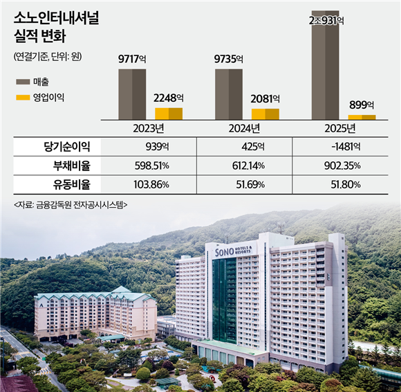 하지만 항공업계가 비상경영에 돌입하면서 소노인터내셔널의 재무부담이 심화될 것으로 전망된다. 지난해 말 부채비율은 902.35%를 기록하며 직전년도 말(612.14%) 대비 290.21% 급증했다. 자본총계가 7780억원에서 8524억원으로 소폭 증가한 반면, 부채총계가 4조 7624억원에서 7조 6914억원으로 3조원 가까이 급증한 탓이다.