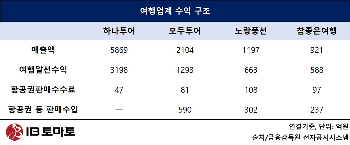 지난해 주요 여행사별 항공권 판매 수수료 수익은 하나투어 47억원, 모두투어 81억원, 노랑풍선 108억원, 참좋은여행 97억원으로 나타났다. 수수료 비중은 각각 0.8%, 3.8%, 9.0%, 10.5%다. 수수료 수익은 낮은 수준이지만 항공권판매 수익은 각 여행사별로 20% 중후반 정도의 매출 기여도를 유지했다.