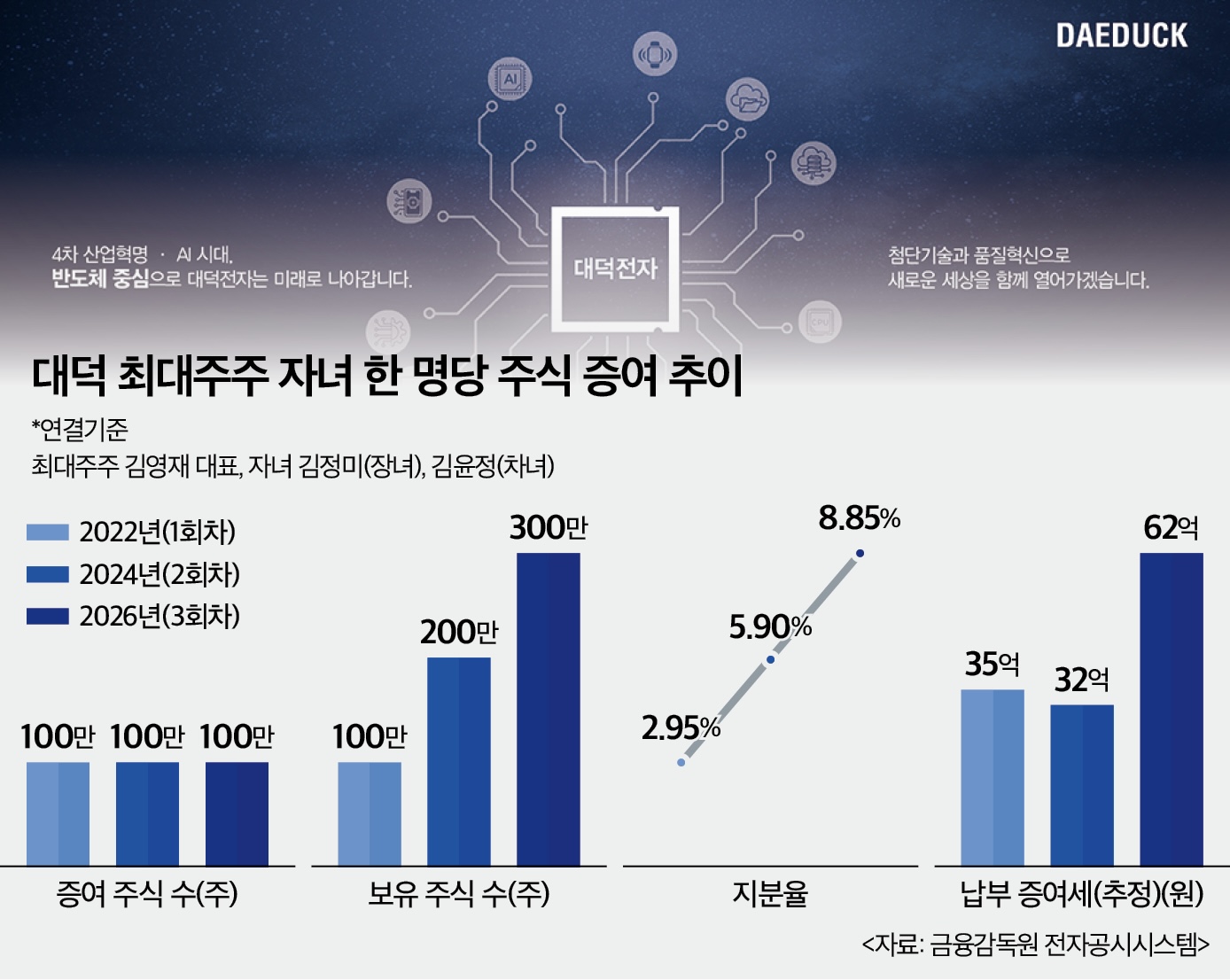 먼저 2022년에는 김정미와 김윤정에게 각각 100만주씩 증여하며 경영권 승계를 위한 첫 준비 작업에 돌입했다. 이어 2024년에도 동일하게 각각 100만주씩 증여했으며, 올해 역시 100만주씩 증여하기로 했다.