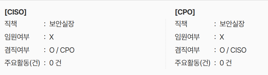 그러나 한국인터넷진흥원(KISA)의 정보보호 현황에서 빗썸이 지난해 11월 공시한 내용을 살펴보면, 빗썸은 지난 2024년까지 정보보호최고책임자(CISO) 자리에 비임원의 '보안 실장'을 지정해 온 사실이 파악됐다. 해당 실장은 개인정보 보호 책임자(CPO) 자리도 겸직해 왔으며 주요 활동은 모두 '0'건이다.
