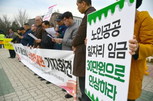장·노년 노동조합 3단체(노년유니온, 노후희망유니온, 시니어노조)가 지난달 7일 서울 영등포구 여의도 국회의사당 앞에서 ‘4·13 총선맞이 노인정책 제안 기자회견’을 하고 있다. 사진/뉴시스