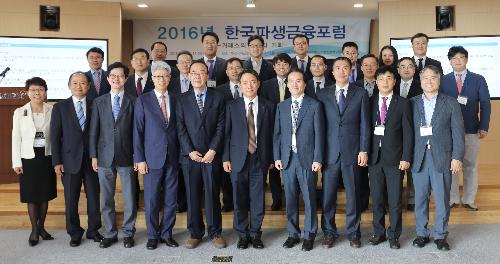 한국거래소는 6일 부산 본사(BIFC)에서 파생상품 관련 학계 및 업계 전문가들이 참여한 가운데 '2016년 한국파생금융포럼'을 개최했다. (첫째줄 왼쪽부터) 자산관리공사 허은영 이사, 조성제 BNK금융연구소장, 동의대학교 남수현 교수, 한국IR협의회 이호철 회장, 부산대 허화 교수, 한국거래소 정창희 부이사장, 한국재무관리학회 정형찬 학회장, 북경금융파생상품연구원(CIFD) Xu Yitai 원장, 금투협 부산지회 이수원 지회장, 부산경제진흥원 황삼진 센터장 등이 기념촬영을 하고 있다. 사진/한국거래소