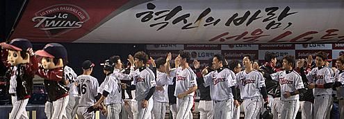 서울 잠실야구장에서 열린 2016 프로야구 포스트시즌 와일드카드 결정전 2차전 LG트윈스와 KIA타이거즈 경기에서 9회말 1사 만루 LG 김용의의 끝내기 희생타에 LG선수들이 준플레이오프에 진출하고 있다.사진/뉴시스