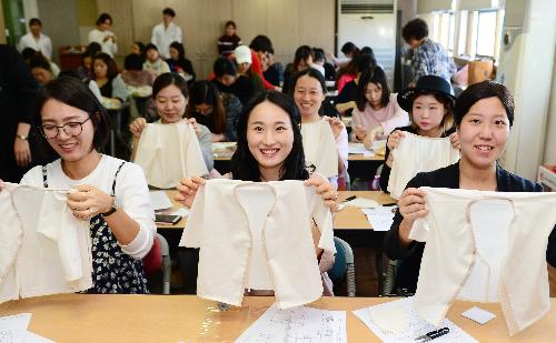 임산부의 날인 지난달 10일 서울 광진구청 보건소에서 열린 '행복한 임신 아름다운 D라인' 행사에서 임산부들이 뱃속의 아이에게 입힐 배냇저고리를 들어보이고 있다. 사진/뉴시스