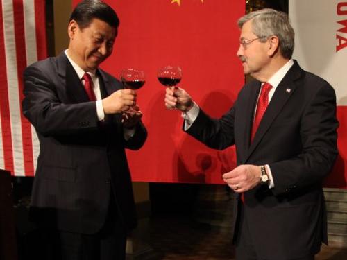 중국 언론이 시진핑 국가주석과 친분이 있는 미국 아이오와주 테리 브랜스타드 주지사(오른쪽)가 미국 트럼프 행정부 초대 주중 미국대사로 선정될 가능성에 주목하는 가운데 지난 2012년 2월 시 주석이 아이오와주를 방문할 당시 두 사람이 만찬 행사에서 와인잔을 들고 있다. 사진/뉴시스(아이오와 지역 일간지 디모인레지스터)