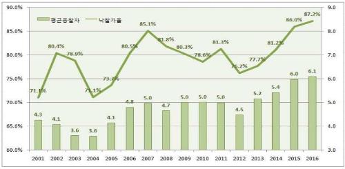 연도별 전국 주거시설 경매 평균 응찰자 및 낙찰가율. 자료/지지옥션