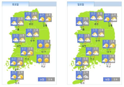 [뉴스토마토 조용훈기자] 토요일(17일)은 구름이 많고, 새벽에 경기동부와 강원 영서에 눈이 조금 오는 곳이 있겠다.