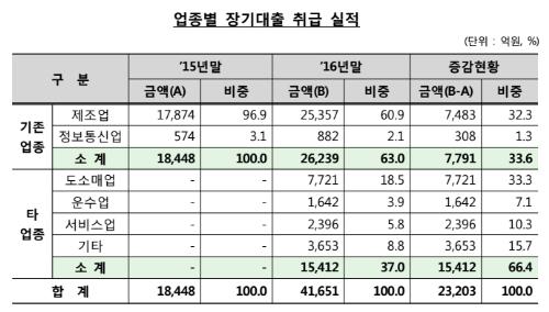 업종별로는 도·소매업 33.3%(7721억원), 제조업 32.3%(7483억원), 서비스업 10.3%(2396억원), 운수업 7.1%(1642억원) 등의 순으로 점유했다.