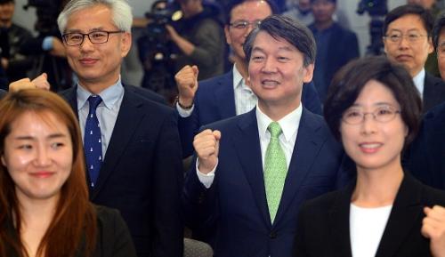 국민의당 안철수 후보가 18일 대전시 유성구 카이스트에서 열린 과학기술인과의 대화에서 참석자들과 파이팅을 외치고 있다. 사진/뉴시스