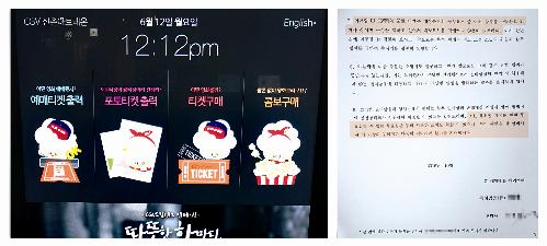 CJ CGV의 포토티켓 발권기(사진 왼쪽)와 특허 침해 주장에 대한 CGV 측의 답변(사진 오른쪽). 사진/뉴스토마토