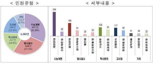이에 따르면, 민원 건수는 수능 개편 관련이 407건(31.8%)으로 가장 많았고 원서접수 348건(27.1%), 학사관리 217건(16.9%), 고사장 199건(15.5%) 순으로 조사됐다.