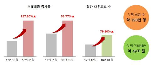 지난해 12월 대비 올 1월 기준 월간 다운로드 수도 79.80% 증가했다. 올해 초 가상화폐 거래소 코인원, 빗썸과의 제휴로 최근 많은 관심을 받고 있는 가상화폐 종목들에 대한 시세 조회 및 주문 서비스를 제공하는 것이 실적 증가에 영향을 줬다는 설명이다. 증권통 측은 "국내 증권 플랫폼 중 동일 플랫폼 내에서 국내 상장 주식과 가상화폐를 거래할 수 있는 것은 우리가 유일하다"고 설명했다.
