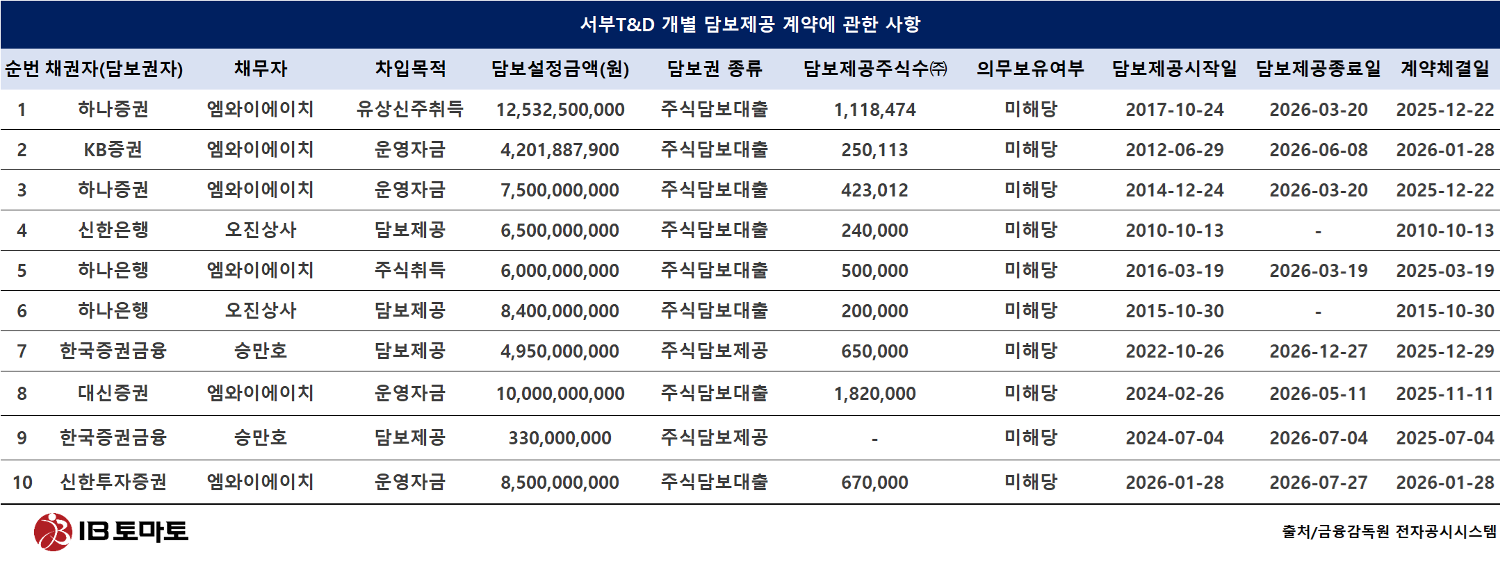 서부T&D 주식담보계약 체결 10건 중 6건 차지