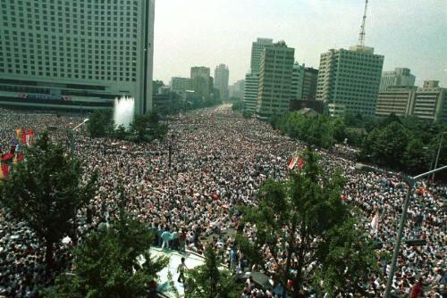 ◇1987년 7월9일 서울시청 앞에 모인 이한열 열사 장례식 행렬. 사진/뉴시스