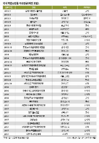 대한상의가 발간한 2015년 유통백서 <국내 복합쇼핑몰 주요 현황>을 보면, 2000년 코엑스몰을 시작으로 오는 2017년까지 총 59곳의 복합쇼핑몰(아웃렛 포함)이 국내에서 운영되거나 새로 들어설 예정이다.