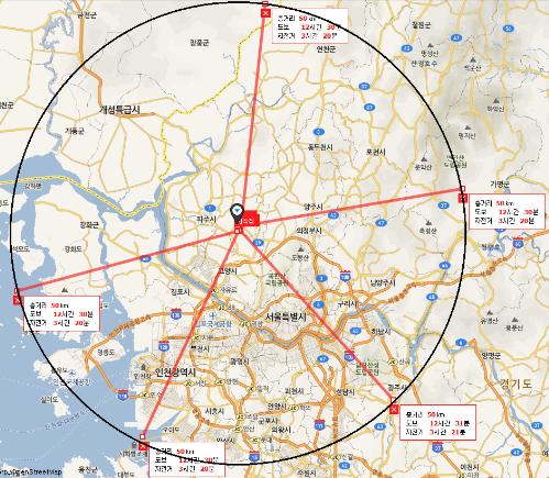 ◇경기도 파주시 서현공원을 중심으로 한 반경 50㎞내 지역. 사진/뉴스토마토