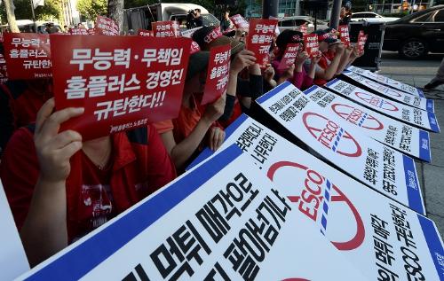 ◇홈플러스 노동조합이 8일 오후 서울 강남구 홈플러스 앞에서 ‘테스코, 최악의 먹튀 매각’을 비판하는 규탄 집회를 열고 있다. 사진/뉴시스