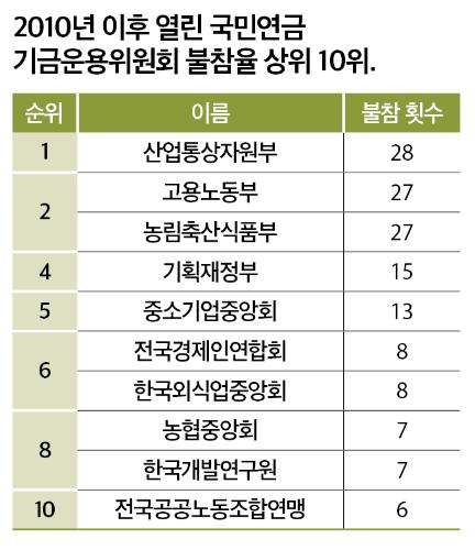 특히 당연직으로 위촉된 정부 측 위원(2015년 기준 5명: 기획재정부·고용노동부·농림축산식품부·산업통상자원부 차관, 국민연금공단 이사장)들의 불참률이 높았다. 2010년 이후 열린 30회의 기금운용위원회 자료를 보면, 산업부는 무려 28회 불참했고, 고용부와 농림부도 각각 27회씩 회의에 빠졌다. 기재부는 15회 불참했다.