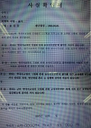 시국선언에 참여한 교사들에게 전달된 사실확인서에는 ▲국정화 반대 시국선언 참여 여부 ▲국정화 반대 시국선언 참여 경위 ▲국정화 반대 시국선언의 참여를 다른 교사에게 권유한 일이 있는지 여부 ▲국정화 반대 시국선언 외에 다른 집단행동에 참여한 적이 있는지 등 4가지 사항을 묻고 있다. 특히 확인서 하단에는 "위 진술내용은 사실이며, 만약 차후라도 허위가 발견될 시에는 어떠한 행정상·신분상 조치를 하여도 감수하겠습니다"라는 내용까지 쓰여있다.