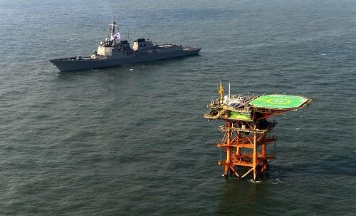 해군 이지스함인 율곡이이함이 종합해양과학기지가 있는 이어도 해역에서 해상경계작전을 수행하고 있는 모습이다. 사진/뉴시스