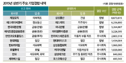2010년에는 포스코의 대우인터내셔널 주식취득(3조4600억원) ▲2011년 SK텔레콤의 하이닉스반도체 주식취득(3조4260억원), CJ제일제당의 대한통운 주식취득(1조8450억원) ▲2012년 롯데쇼핑의 하이마트 주식취득(1조2480억원) ▲2013년 라이프투자의 ING생명보험 주식취득(1조8200억원) 등이 진행됐고, 지난해에는 제일모직과 삼성물산의 8조원대 초대형 합병까지 성사됐다.