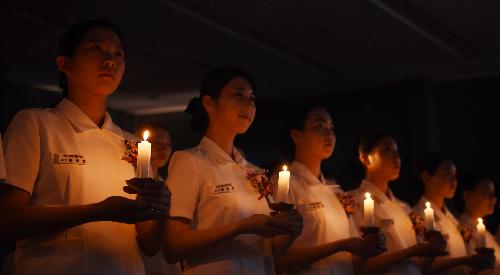 국군간호사관학교는 2015년 10월16일 오후 대전 자운대 교내 백합관 강당에서 간호사관생도 58기 나이팅게일 선서식을 개최, 생도들이 촛불을 들고 서 있다. 사진/뉴시스