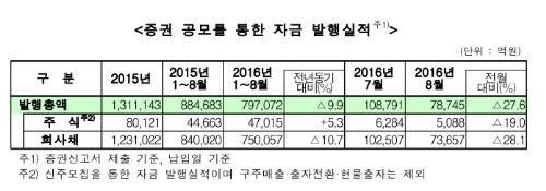 금융감독원이 6일 발표한 ‘2016년 8월중 기업의 직접금융 조달실적’에 따르면 8월중 공모를 통한 기업의 주식 및 회사채 발행 실적은 총 7조8745억원으로 집계됐다. 전월 10조8791억원 대비 3조46억원(27.6%) 감소했고 1~8월 누적기준으로는 79조7072억원으로 전년 동기 88조4683억원보다 8조7611억원(9.9%) 줄었다.