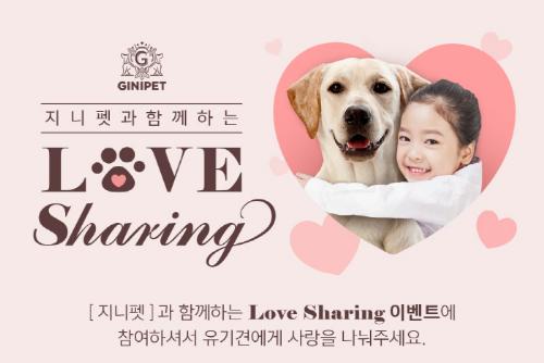 러브 쉐어링의 '1 for One' 이벤트는 지니펫 구매 시 동일 제품과 수량을 유기견을 위해 기부하는 행사로, 지니펫 쇼핑몰에서 제품을 구매하면 자동으로 행사에 참여가 되고 그 내용을 본인의 SNS에 공유할 수 있다.