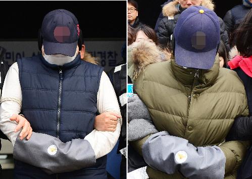 부천 초등생 아들 최군 시신훼손 사건으로 폭행치사, 사체손괴·유기 등의 혐의를 받고 있는 친 아버지 최모(34,왼쪽)씨와 어머니 한모(34)씨가 현장검증을 하기 위해 지난 1월 경기 부천시 원미경찰서에서 나서고 있다. 시잔/뉴시스
