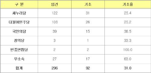 유력정당 후보자 기소율을 보면 새누리당이 31명 기소로 25.4%, 더불어민주당 25.2%(26명), 국민의당 38.5%(15명), 정의당 33.3%(1명)으로 나타났다. 민중연합당은 입건된 후보자 2명이 모두 기소됐으며 무소속은 27명 중 17명이 기소됐다. 전체 기소율은 296명 중 92명이 기소돼 31%의 기소율을 보였다.