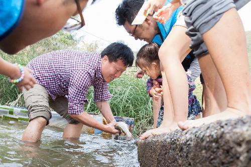 '효성과 푸르메재단이 함께 하는 가족 여행' 참가자들이 송어 잡기를 하고 있다. 사진/효성그룹