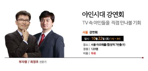 증권 정보 사이트인 이토마토(www.etomato.com)의 인기 전문가 부자왕, 최정호 전문가가 10월 22일(토) 서울 아르떼홀에서 야인시대 증권 강연회를 개최한다. 23일(일)에는 이토마토 홈페이지, 증권통 투자클럽 어플리케이션에서 하승훈, 최병운 전문가가 온라인 강연회를 진행한다.