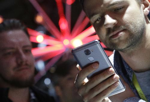 러에코 신제품 발표회에 참석한 사람들이 스마트폰 러프로3를 살펴보고 있다. 사진/뉴시스·AP