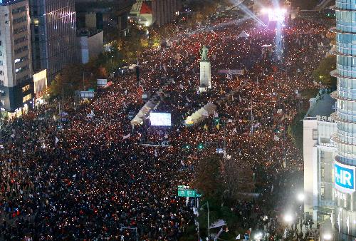 5일 오후 서울 광화문광장에서 민중총궐기투쟁본부와 대학생 시국회의 등 단체 회원들과 자발적으로 전국에서 모인 약 10만명(주최 측 추산, 경찰 추산 3만명)의 시민, 청년학생들이 '모이자! 분노하자! #내려와라 박근혜 범국민대회'에 참석하여 박근혜 대통령과 청와대 비선실세 국정농단을 규탄하며 대통령 하야 촛불집회를 하고 있다. 사진/뉴시스